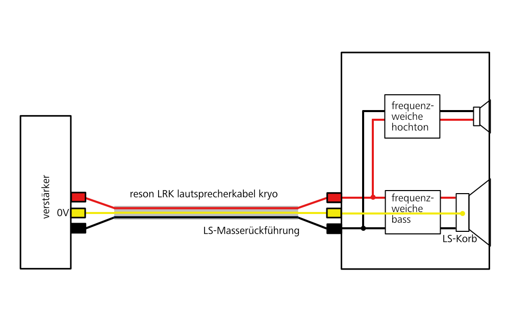 Auf den nebenstehenden Abbildungen ist das Prinzip der Lautsprecher-Masserückführung zu sehen. FYNE Lautsprecher made in Scotland (F500SP..., F700..., F1...-Serien) haben alle einen Masseanschluss. Als Lautsprecherkabel sind unsere 3-poligen LRC und LRK kryo Kabel ideal geeignet. Für Anschluss am Verstärker hilft unser MAC-Adapter.