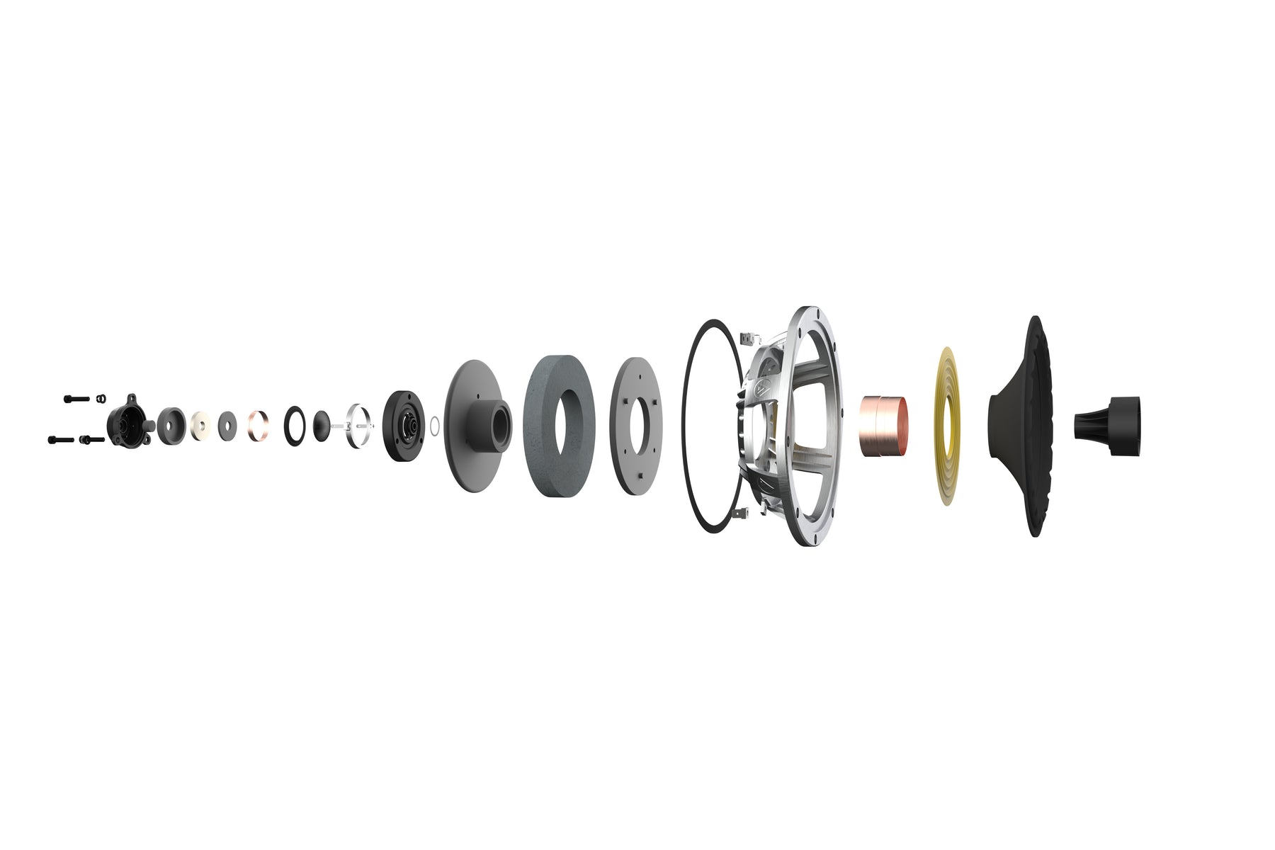 Eine belüftete Rückkammer im Neodym-HF-Magneten sorgt für eine niederfrequente Resonanz weit unterhalb des Übergangsbereichs. Und die hochsteife Hochfrequenzmembran aus Magnesium oder Titan, die den Break-Up-Modus weit über den menschlichen Hörbereich hinaus verschiebt, führt zu einem homogenen und ausgedehnten Hochtonbereich. Die einzigartige Geometrie des Schalltrichters der Hochfrequenz-Einheit sorgt für einen flachen Frequenzgang und vermeidet interne Reflexionen.